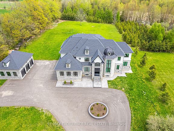 Welcome to this exquisite custom-built luxury home, nestled on a private 2-acre lot (200' x 436'). Built in 2021( First occupied 2023), this grand estate offers nearly 7,700 sq ft of beautifully finished living space with 7 spacious bedrooms, 7.5 luxurious bathrooms, and a total of 6 garage spaces with parking for over 20 vehicles. As you approach the property, you're greeted by premium stone and brick exterior, beautifully complemented by outdoor wall lighting, and extensive pot lighting that enhances the home's striking curb appeal.The grand stamped concrete front entrance is framed by a professionally designed circular flower garden, setting the tone for the elegance that awaits inside.This home features 10 ft ceilings on the main level, 9 ft ceilings on second floor and in the basement, engineered hardwood floors, 8 ft doors, pot lights, wainscotting, motorized blinds, and a retractable central vacuum system. The main level offers a dramatic open-to-above foyer with heated book match porcelain floors, a guest suite with ensuite and walk-in closet, a formal dining room with custom accent wall, a large living space with 19 ft ceilings, and a designer kitchen with Jenn-Air appliances, quartz countertops, a waterfall island, pot filler, and a servery. A fully equipped spice kitchen adds additional convenience for entertaining. Upstairs, the primary suite includes a walk-out balcony, walk-in wardrobe, and spa-like ensuite with waterfall shower. All bedrooms feature ensuite bathrooms and custom walk-in closets. The open hallway is sun-filled and airy, and the upper laundry includes a Samsung steamer. The walk-out basement includes a theatre room, spacious rec room with bar, electric fireplace, 2 bedrooms (one with ensuite), premium vinyl flooring, rough-in for radiant heating, and ample storage with custom cabinetry. A rare opportunity to own a truly luxurious, move-in ready home with timeless finishes and exceptional craftsmanship in a peaceful country setting.