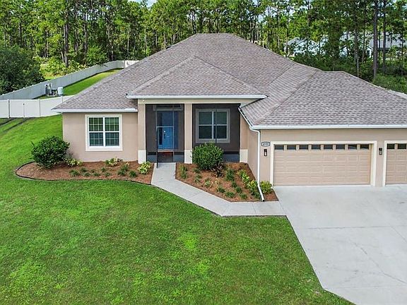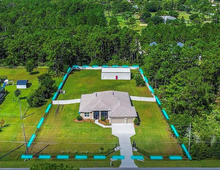 Welcome to this stunning home, quality-built in 2019 with high-end finishes, set on a spacious 1.24-acre fully fenced lot with no wetlands. From the moment you arrive, the high-end aluminum front fencing with solar lights and gated entry make a beautiful first impression. The backyard is secured with premium vinyl fencing and oversized panel gates, providing easy access for large vehicles to the impressive metal garage with full electric service. The property also features a dedicated irrigation system supplied by the well, separate from the home’s water system. This thoughtfully designed home offers 4 bedrooms, 3 full baths, a versatile den/office/flex space with glass French doors, and a 3-car garage. With a total of 3,987 sq. ft. (2,789 under air), the layout emphasizes comfort and function. The primary suite spans 585 sq. ft., complete with dual walk-in closets and a luxurious bath featuring a frameless glass shower. The heart of the home is the open-concept living area, boasting an expansive 27' x 19' great room with 11-ft ceilings that flow seamlessly into a gourmet kitchen. Highlights include real wood shaker cabinetry, Quartz countertops, an oversized island, and Samsung stainless steel appliances. A 12-ft tray ceiling in the dining area, wood-look tile flooring throughout main areas, 8-ft interior doors with brushed nickel hardware, and recessed LED lighting add elegance throughout. Additional features include a large screened lanai overlooking the backyard with a convenient fenced-in dog area directly accessible from the lanai, a covered and screened front porch, a 15 SEER heat pump with digital thermostat, Delta brushed nickel fixtures, storage cabinetry in the laundry room, a 3-car garage with two automatic openers, and 8-ft tall 3-panel sliding glass doors that flood the living space with natural light. This property blends modern luxury, functionality, and privacy—a rare find in today’s market. A highlight of this property is the spacious 30’ x 50’ metal building (2020) situated on a solid concrete pad. This versatile structure offers outstanding functionality for storage, workshop use, or hobbies. Inside, it features ample lighting and electrical outlets for convenience, along with two large pull-down doors on opposite ends that allow easy drive-through access for vehicles, equipment, or large storage items. A secure side entry door provides additional accessibility, and all entry points are lockable for peace of mind. With its clean lines, durable construction, and flexible layout, this building adds tremendous value to the property.