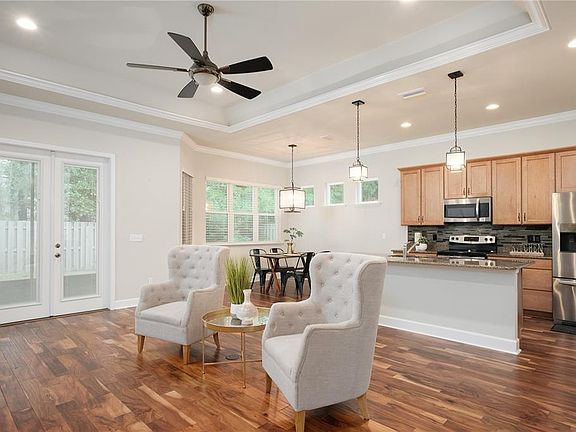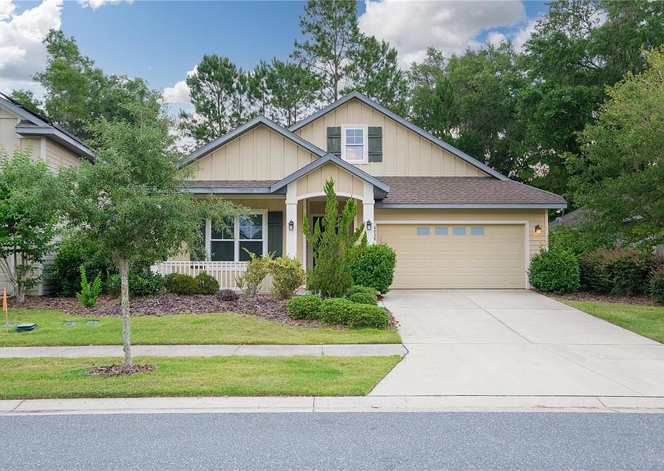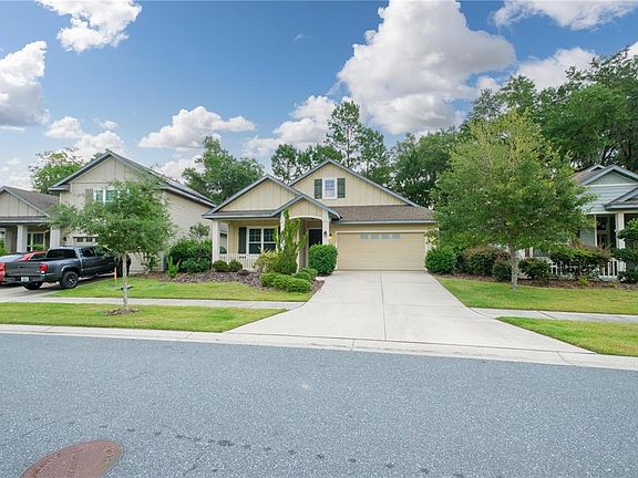 2016-built Tommy Williams home in Finley Woods fronting the common area! Located just off Williston Rd close to I-75 and SW 34th St, this beautiful neighborhood is a super quick drive to UF Health, the VA, University of Florida, Celebration Pointe and Butler Plaza! Location can't be beat! Sprawled on almost 1600 sq ft of H/C space, this well-kept home offers 3 beds and 2 baths, open concept and the upgrades of a newer home! High flat ceilings, beautiful wood floors in main areas, tray and crown molding, front and back covered porches, screened in lanai, paver patio, fully fenced in! Extra-spacious great room, kitchen and dining room all in one hub & can watch TV from each space! Kitchen has wood cabinetry, trash pull out, soft close drawers, pot/pan drawers, island for generous work & dining area, granite counters, backsplash and stainless steel appliances! Owner's suite with walk-in closet (with extra shelving racks), split vanities and a walk-in shower with niche and bench! Separate laundry room (not a walk through), large pantry, blinds, gutters, plenty of transom windows, actual closet doors (not bi-fold), fans in rooms, solar panels, laundry tub in garage, irrigation system are other features! Washer/Dryer convey! HOA maintains the front yard! Call now!