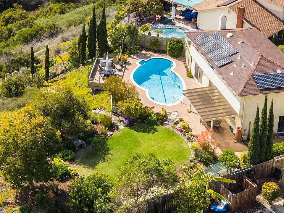 You'll love resort-style living in this canyon-rim "Park West" home w/ saltwater pool! This remodeled home boasts a huge flat backyard w/ Trex deck overlooking canyon, quiet culdesac, 3-yr-new heat & A/C, 14 solar panels (house only), alluring curb appeal & immaculately maintained yard. Oversize kitchen offers verde granite, recess lights, pull-out pantry, newer appliances, sunny canyonview window. Don't miss the spa bathtub, woodburning FPL, built-in speakers, dual rainwater storage system, weather station, firepit & peach/apple/avocado/blueberry/citrus trees! A chip shot from Gershwin Park (tennis, basketball, playground) & 0.7 miles from Clairemont Town Square shopping & dining. Property line extends well beyond fence, per seller.