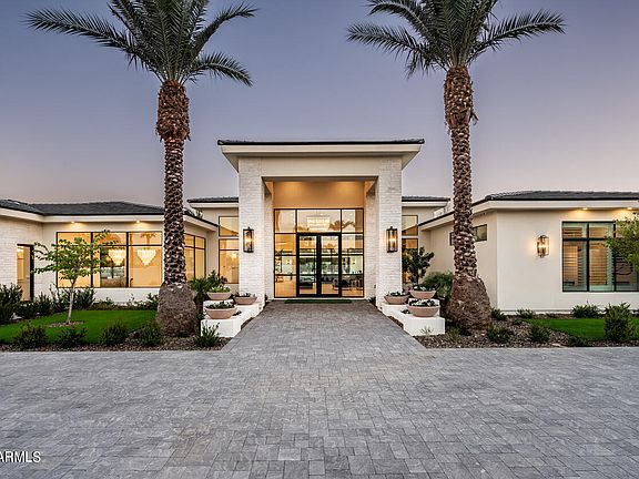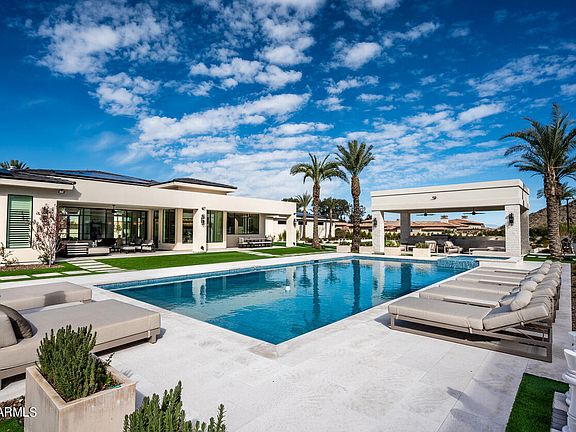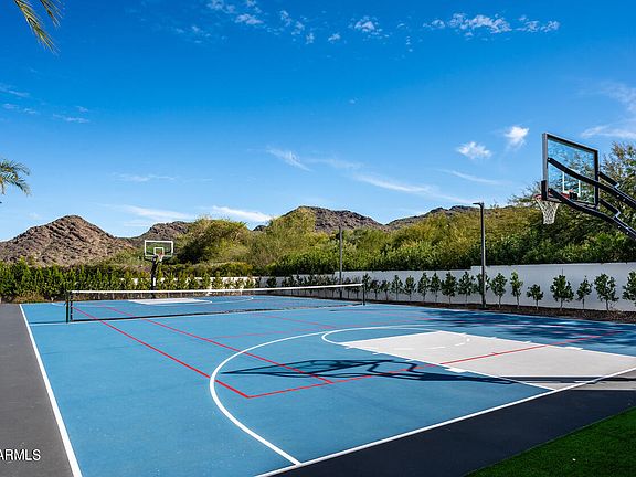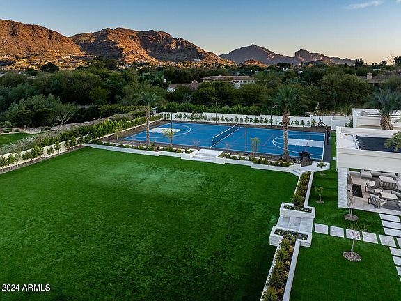 Set on 2.07 acres with commanding views of Mummy Mtn, this new 10,051 sf transitional estate finished Nov. 2022, has a massive turf lawn, NBA basketball court with tennis and pickleball lines, 2 guest homes and garages for 20+ cars! Enter an elegant great room with light oak floors +16 ft ceilings open to a chef's kitchen w /quartzite island + large back kitchen. In addition to the 6 car garage attached to the house-- there is a HUGE MULTI-PURPOSE 16 FT HIGH AIR CONDITIONED BUILDING for 3 RV's, 15+ cars or an amazing entertainment space! 4/5 bedrms in the main house plus 2 guest homes-- a 1 bedrm + 2 bedrm, each with their own kitchen, livingrm + laundry. Fully solar with minimal electric bills. There is also a fabulous pool+ spa, cooking ramada, life-size chess set + fire-pit! Large paver driveways will accommodate approximately 30 cars.