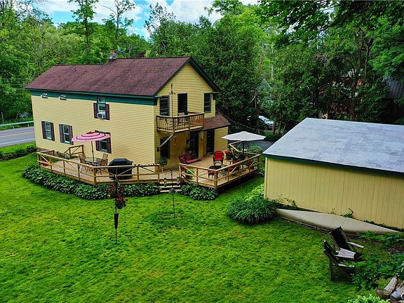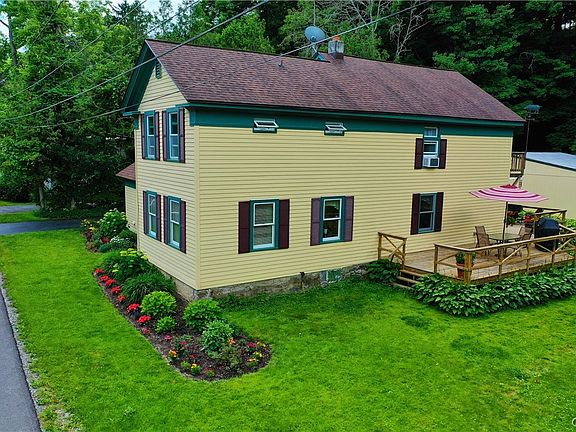 This is just a fabulous home and there are so many reasons why the sellers have loved it for over 30 years! Part of the home is from the 1800s combined with a more modern addition. Together it creates a mix of character, charm, modernization, and coziness all while providing more than 2200 SF of updated living space. The kitchen is warm & beautiful with a soaring ceiling, cherry cabinets and maple hardwoods. It was updated with granite counters & breakfast bar. The formal dining room has cherry floors and can accommodate a large table for gatherings. Upstairs offers 3 great size bedrooms with 50-year Bruce oak flooring. The master bedroom has the coolest skylight situated for star gazing from bed. A balcony. And a large bathroom & ample closet space. Outside is such a feature in itself. Nestled between a ridge and the Chittenango creek, the ambiance is amazing. Add the 700SF of treated deck, gorgeous perennial beds, rustic firepit area, perfect spots for bench swings, you'll like it outside as much as inside. The garage is 24x24 -half for parking, & the other half as a shop. It's serene here but also just a 5 minute drive to Caz village. And so close to Chittenango Falls. 10/10!