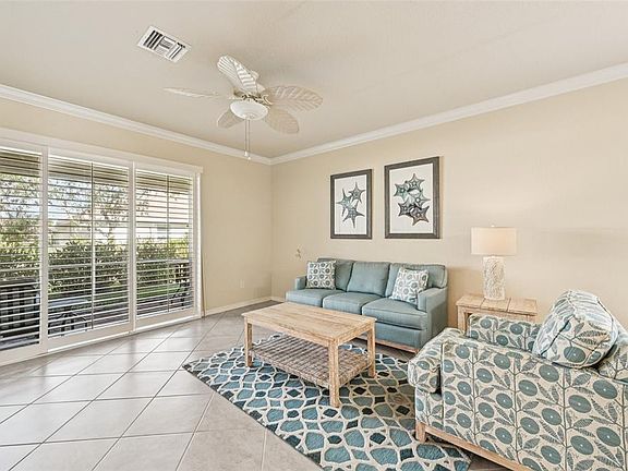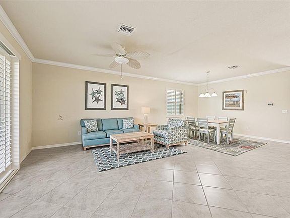 Your vacation does not have to end! This 2016 built 4 BR, 3 BA, 2-car garage home in the gated, maintenance-free resort-style community "The Villas at Charleston Park" comes partially turnkey furnished and will delight you with its open floor plan and abundance of natural light. It features whole house accordion hurricane shutters for peace of mind and Plantation shutters in the main living areas. Enjoy your morning coffee at the granite breakfast bar, overlooking the gourmet kitchen with Maple cabinetry, granite counter tops, stainless-steel appliances, pull-out shelving and a walk-in pantry. Your Great Room and Dining area are ideal to gather with family and friends and the split floor plan allows for privacy. Your Guest bedroom offers an en-suite bath and would make an ideal home office. The 3rd and 4th bedroom share a bathroom with a shower over tub. Your Primary Bedroom Suite features 2 large walk-in closets and the Primary Bath has a garden tub, walk-in shower and double sinks. Step onto your lovely screened lanai for Happy Hour with friends or enjoy relaxing hours in the quiet setting. You will love the Florida lifestyle at the Villas at Charleston Park with its resort-style pool, large sun deck and Clubhouse with fitness room, library and lots of activities for its residents. Close to area beaches, shopping, restaurants & the many amenities of Wellen Park, including the Atlanta Braves Spring Training stadium. Public water & sewer. No CDD! No flood zone!