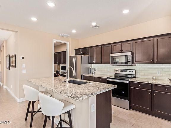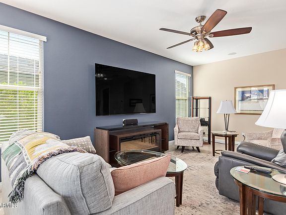2 Bedroom, 2.5 Bath + Den/Office/3rd Bedroom with 3-Car Garage home. The stone-accented façade & cozy front porch welcome you, while a tandem 3-car garage adds convenience. Inside, 2 main bedrooms plus a versatile den/office/3rd bedroom & 2.5 baths await. The kitchen boasts granite counters, island w/breakfast bar, stainless steel appliances, walk-in pantry & ample cabinetry. The primary suite offers a sitting area, dual sinks, glass shower & custom walk-in closet. A 2nd main bedroom has its own bath & custom organized walk-in closet. Tile floors & glass doors flow seamlessly to a backyard oasis w/party lights, fire pit & sitting area. Living room w/pre-wired surround sound is perfect for gatherings. Enjoy Victory Club's 4 pools, pickleball, tennis, golf, fitness & The Vic Bar + Kitchen.