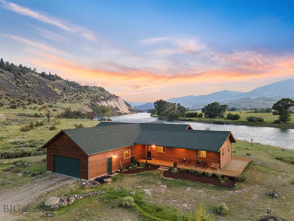 LOCATED ON THE EAST BANK OF THE MAJESTIC YELLOWSTONE RIVER less than 30 miles South of Livingston, MT and 25+/- miles to the North Entrance of Yellowstone National Park at Gardiner, MT rests this beautifully designed custom one level 4 bedroom, 3 bath home with an oversized attached 3 car garage and wrap around deck. The open floor plan is anchored with an attractive gas fireplace, hardwood floors and large windows throughout that make the river and the surrounding mountain views the main focus. The 20+ acres are divided by East River Road providing a nice spot for a guest house or support buildings on the East side. On the West side, the home is gently tucked beneath a hill shielding it from the road. The 600+/- feet of river frontage is an angler’s delight providing unfettered access to fishing on the last undammed river in the lower 48 states. Two long riffle runs adjoin the property’s river bank and provide unlimited opportunities to tempt wily Yellowstone River trout. The current owners named their river front home the “Caddis Shack” after one of the Yellowstone’s legendary insect hatches. The river also encourages a robust wildlife habitat for viewing. This area of Montana provides endless opportunities for recreation, fine dining and entertainment.