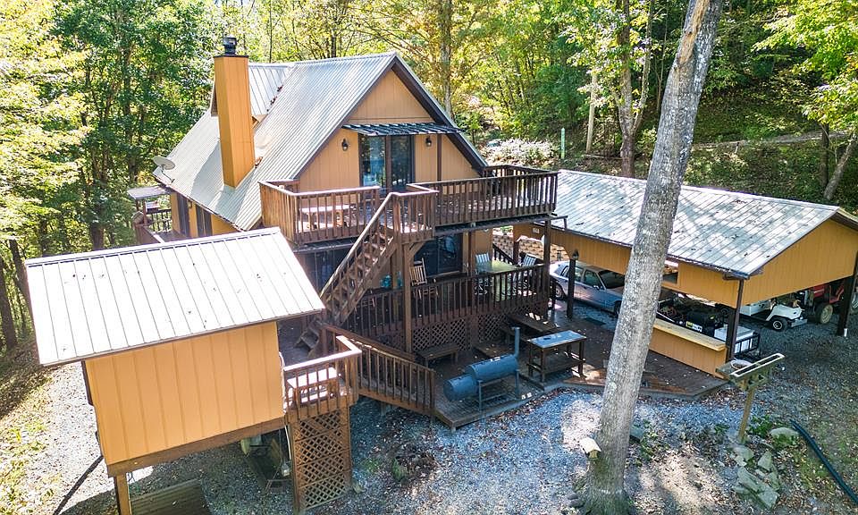 Experience the charm of mountain living in this well-maintained, move-in ready cabin featuring breathtaking year-round views, no restrictions, all on 14.69 ac. Mature landscaping with sprinkler system. Thoughtfully designed floor plan with great flow and ample storage. Home designed as a 3-bedroom with a 2-bedroom septic permit. Primary bedroom has deck access to enjoy nature & updated bath on the main level with newer toilet, vanity, & fixtures Second-level bath also features newer toilet & fixtures. Two half baths (main level & basement) for convenience. Tile floors in baths & kitchen, ceiling fans, & recessed lighting throughout. Beautiful Stone fireplace plus individual wall heaters in every room for optional zone heating. Split heat pump, backup heat, whole-house generator, & security system. Main-level laundry located in the hallway. Fully furnished with extras! Full basement with additional heated area, office, half bath, & wood storage bin. Covered decks with outdoor kitchen for gatherings with a mountain backdrop. Private & community well access. Roof & HVAC 22/23. Detached 26x41 garage, heated, RV parking, automatic doors. Extra parcels-great for further building!