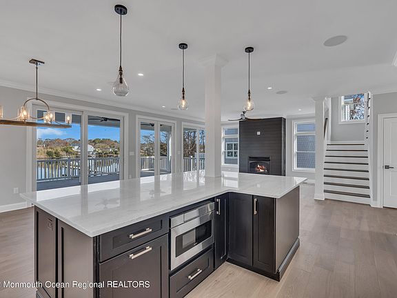 Newly built custom designed 5 bedroom, 3 bath waterfront Shore Colonial is in the desirable Princeton Ave section of Brick. The 1st level has an open floor plan comprised of living room w/gas fireplace, dining area, custom kitchen w/quartz center island, a 5th bedroom/den, full bath, finished laundry room, & covered porch overlooking river. The 2nd level has a primary bedroom w/full bath & private balcony, 3 additional bedrooms & hallway bath. The 3rd floor rec room includes wet bar & balcony. Additional features include 3 stop elevator, pre-wired interior & exterior speakers, hardwood floors, & upgraded finishes. The exterior features an in-ground, heated, salt-water pool, paver patio backyard, & shared 110' dock.