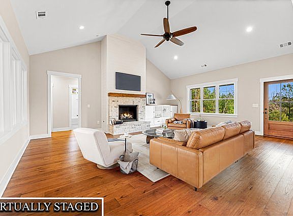 Inside, this upscale new construction features a warm and inviting design with hickory hardwood floors, porcelain tile, an oversized kitchen island, abundant cabinetry, quartz countertops, and a generous walk-in pantry. The open, vaulted great room flows seamlessly into the dining area and kitchen, creating a bright and welcoming space for everyday living and entertaining.
