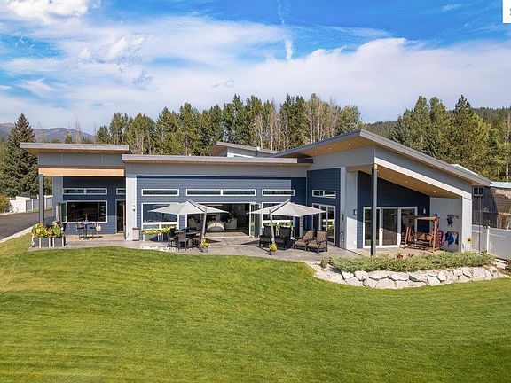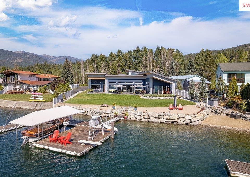 This nearly new 4,534 SF custom waterfront estate on the Pend Oreille River boasts approx. 120’ of stunning riverfront and is a true showcase of modern luxury. A dramatic 5’ mahogany door welcomes you into soaring ceilings, walls of glass, and open-concept living. The Great Room features a bonfire-style fireplace and flows into the dining area and outdoor patio through Custom Panorama doors. A chef’s kitchen offers pro-grade appliances, a large island with a glass eating bar, and a pass-through to the patio. The main-level Primary Suite includes private patio access and spa-style finishes. Upstairs features a spacious rec room and 3 bedrooms. Enjoy two private beaches, a manicured lawn, and a large dock with a slide and diving board. Oversized heated garage, whole-house generator, and RV parking add year-round comfort. Located near Sandpoint, Schweitzer, and Lake Pend Oreille—this rare estate blends elegance, recreation, and North Idaho beauty.