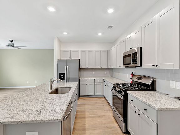 entertaining. At the front of the home, you'll find two versatile bedrooms, a full bath, and ample storage with both a coat and linen closet. The open-concept kitchen is a true highlight, featuring a large island with seating, sleek shaker cabinets, granite countertops, subway tile backsplash, and stainless steel appliancesincluding a gas range, built-in microwave, and dishwasherall overlooking the dining area and great room. The master suite is a peaceful retreat, complete with new LVP flooring, a spacious walk-in closet, dual vanities, and a walk-in shower. Additional conveniences include a dedicated laundry room, a two-car garage with an opener and remotes, a tankless water heater, and upgraded finishes throughoutfrom wood laminate flooring in the main living areas to tile in baths and laundry.