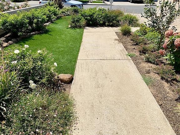Gorgeous adult village home with 2 bedrooms plus den with double doors. This home is pretty special with it being recently remodeled with granite counters and full backsplash granite in kitchen. Both baths redone, tiled floors throughout home, crown molding in every room, stainless appliances, plantation shutters throughout on windows and sliders,flagstone patio front and back, gas log set in fireplace, tiled roof and 2 car garage with one whole wall of built in storage cabinets. Front lawn is artificial turf plus beautiful flowering bushes and flowers, all on drip irrigation. Garage floor has been epoxied in a beautiful blue and a privacy fence installed on the living room side.