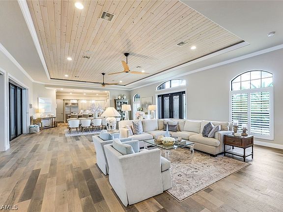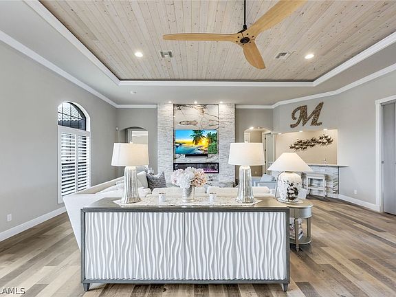 This exquisite luxury residence is a rare gem, nestled on an expansive, nearly half-acre lot with captivating views of the surrounding canals and a remarkable 300 feet of captains walk. The striking exterior boasts a brilliant facade, setting the stage for an unparalleled living experience. Boasting four bedrooms, four full baths, and just under 4000 square feet of living space, this home offers an impressive total area of nearly 8000 square feet.