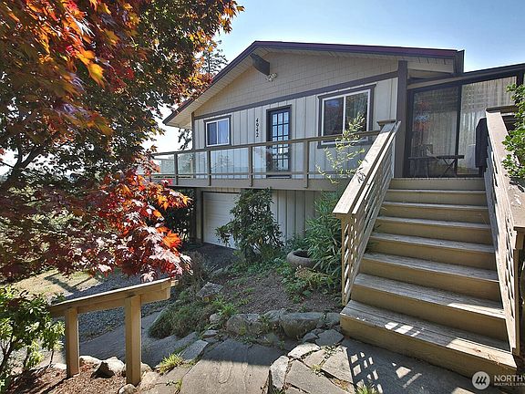 Offset from the street, offering a sense of privacy & perched to capture views of the Sound and Cascades. Step inside to T&G vaulted ceilings with an open-concept living space & views throughout. Relax & warm yourself, come Fall in the sunroom. The cook in the house will be pleased with the sizable kitchen & vast island. Wake up to views from the Primary bedroom, which features a fireplace & view deck access. Updated bath has a large walk-in shower, soaking tub, vanity area & walk-in closet. There is a perfect space for a home office setup. Downstairs can be a second primary bdrm that has a 3/4 bath & closet, or a flex room to meet your needs. A workshop-storage rm with a 1/2 bath sits off the garage. New auto generator, windows & gutters.