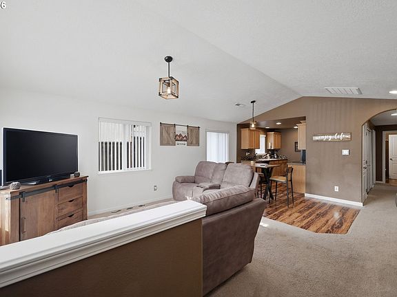 Built in 2012 by Hayden Homes Construction, this well-maintained residence is located in the desirable West Wind Estates community and offers 1,042 square feet of thoughtfully designed living space. The open and airy floor plan is enhanced by vaulted ceilings, creating a bright and welcoming atmosphere throughout the home. The property features two comfortably sized bedrooms, including a spacious primary bedroom designed for both function and privacy. The bathroom can be accessed from the hallway as well as directly from the primary bedroom, providing the convenience and feel of an attached bath. The primary bedroom also includes dual closets and sliding glass doors that open to the backyard patio, extending the living space outdoors. Over the past five years, the seller has completed numerous updates that add both style and comfort. These improvements include quartz countertops and tile backsplash in the kitchen and bathroom, new flooring throughout, new light fixtures and electrical wall plates throughout, updated interior and exterior paint, upgraded 3-inch baseboards and trim, black stainless steel kitchen appliances, and the addition of an air conditioning unit. Exterior enhancements also include a retaining wall along the backyard, along with additional concrete expanding the patio and walkway. The home was constructed with durable lap and T-111 siding and includes a fully finished, extended-length garage offering flexibility for parking, storage, or alternative uses such as a home gym or hobby space. The home sits directly across from a maintained green space, providing peaceful views of trees and grass and a sense of openness. The HOA maintains grassy common areas and a lighted walking path, ideal for pets, exercise, or enjoying fresh air. Meticulously cared for, this home combines practical updates, efficient use of space, and a convenient community setting—making it an excellent option for buyers seeking comfort, quality, and low-maintenance living.