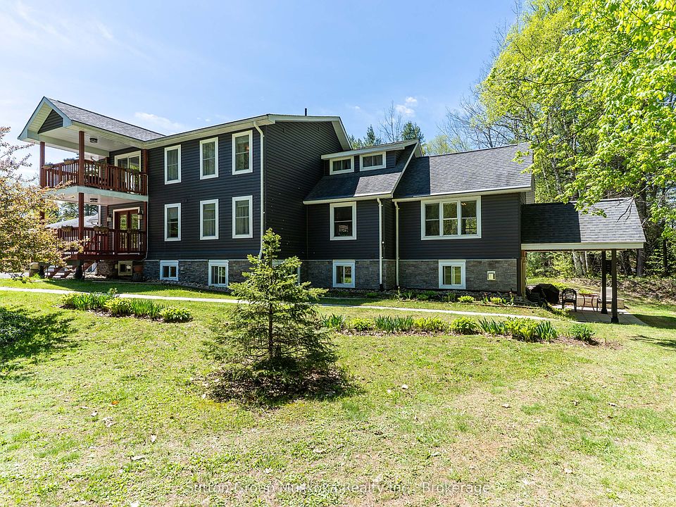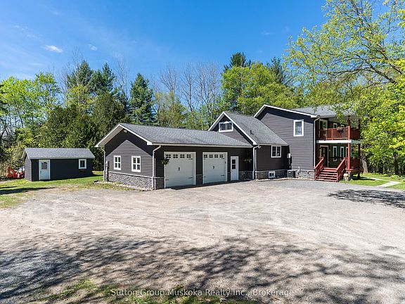 Welcome to this expansive home situated on 7+ acres in the charming village of Dorset. Previously, a popular licensed Bed & Breakfast for Muskoka tourists, it is now a cherished residence with separate bedroom suites for family or visiting guests. Great place for multi-generational. Boasts 3 sprawling levels, over 5000 sq. ft. combined. The upper level has three bedrooms & three ensuite bathrooms with in-floor heating, plenty of closets, sitting areas, & an upper deck to enjoy the outdoor weather. Step inside from the covered porch on the main level to the grandeur of the front entryway. Updated kitchen with breakfast bar seating for a quick snack, an eat-in area or use the formal dining room to enjoy your meals. You may choose the views from the Muskoka sunroom, which ensures entertaining days, enjoy the ambiance from the corner propane fireplace in the living room or find your favourite book on the shelves in the sitting area. Work from home or study in the adjacent quiet office. Return to the kitchen, grab a coffee from the coffee bar, & proceed through the bi-fold door leading down the carpeted stairway to the lower level. Here, enjoy a large recreation room, which currently holds the train hobby enthusiasts' collection. Please do not touch the trains or tracks, but stare in awe! Continue through this level to the potential two-bedroom in-law suite featuring a bright kitchen, living areas, bathroom, laundry, and a propane fire stove. Outside-living has a cleared lawn area for games, beautiful established gardens, an outdoor sauna & two showers, decks, a storage shed, & an outdoor wood furnace that heats the two-car oversized garage. Other features include a wired Generac generator, a dug well and an oversized septic, allowing for potential further development. Minutes to Lake of Bays beaches, boat launches, recreation trails, parks, shops, restaurants, and essential amenities. This lovely home has space for all, all your things, all your people & all your pets!