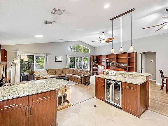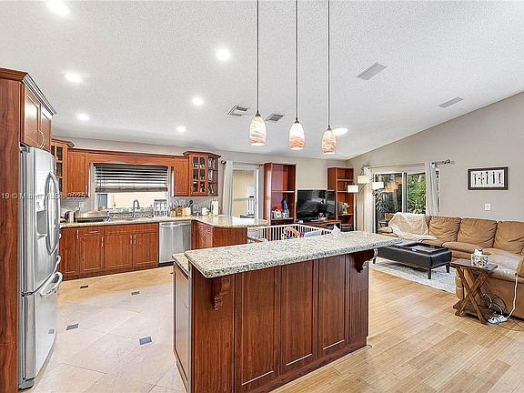 Courtesy of Galiano Realty Group Discover this 3 bed/2 bath charming home nestled in the exclusive Banyan Oakridge Gated Community in Hollywood. Offering a spacious, open floor plan with beautiful bamboo flooring throughout, this home is designed for modern living. The updated kitchen features stainless steel appl., a wine cooler and granite countertops. The luxurious master bath boasts travertine finishes, a large frameless glass shower, and a convenient built-in dresser. Step outside to your private backyard oasis, complete with a sparkling pool, ideal for relaxation or hosting gatherings. This home is located within walking distance to worship houses. The community offers security, tennis courts, basketball courts, and playground.