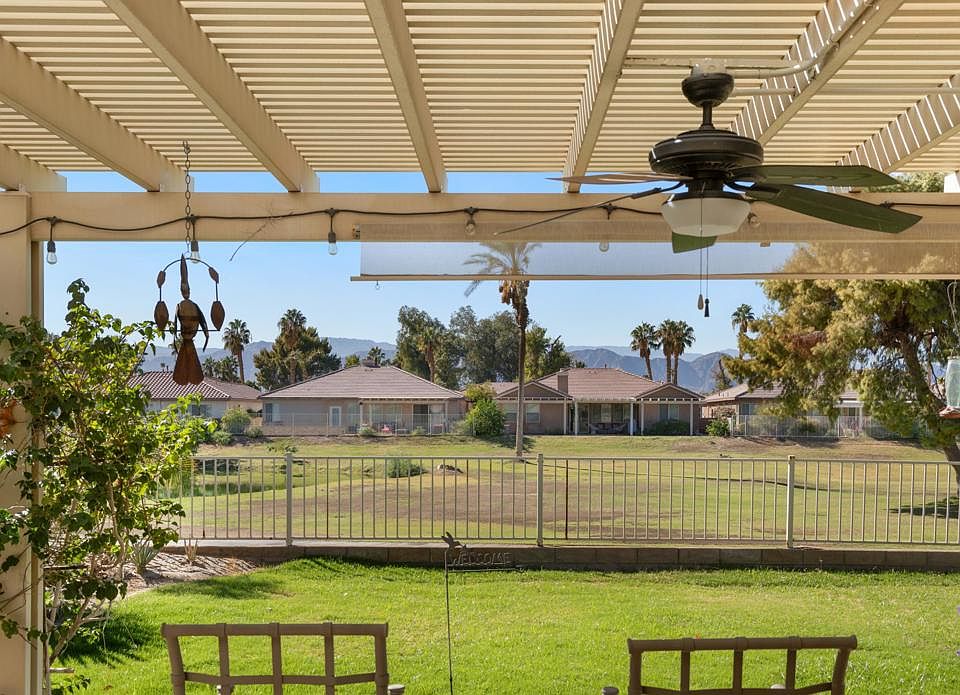 Exceptionally clean move-in ready home sits in the perfect location with Golf Course, lake, fairway and mountain views. There is a gated front courtyard with pergola, & 2 fountains. Perfect for morning coffee. Enjoy entertaining family and friends on a spaciou】s covered back patio with rolling sun shades overlooking fabulous views. Main house has 2 bedrooms, 2 full baths, a flexible space for use as den, office or media room. Spacious open floor plan makes entertaining family & friends easy. Great room with built-in TV cabinet, gas fireplace and view of very large kitchen that has granite counters, large island with pendant & recessed lighting, 4 bar stools & abundant counter space., LG stainless appliances, under cabinet lighting and pantry. Master suite has newer carpet & access to back patio, Master bath has dual sinks, jetted tub and shower stall., Large walk-in closet. Hall bath with sliding barn door, granite counters, modern glass bowl sink and shower over tub. Inside laundry room with LG washer & dryer and cabinets. Detached Casita with private entrance to a 1 bedroom & 1 full bath and its own ac/heating. Window coverings include Plantation shutters and blinds,; Ceramic tile in living room & kitchen witih mosaiic tile in entry, wood lamintate floors in flexible space area and casita; carpet in main house bedrooms. Ceiling fans throughout,. 3 car garage - one is tandum, perfect for a golf cart. Painted garage floor, overhead storage racks, work bench, sink and storage cabinets. Home in move-in condition and is ready for you now. Just bring your own furniture and come enjoy your new home. Indian Palms Country Club offers resort style amenities, including a gym, sale water pool, spa, fitness, clubhouse, tennis, pickle ball, bocce courts, varous classes and 27 holes of golf all within a guard gated community. Located within minutes from Polo Club, shopping and dining. This is a must see impeccable home offered unfurnished. See personal inventory list of items available for sale outside of escrow. Golf course is under new management.