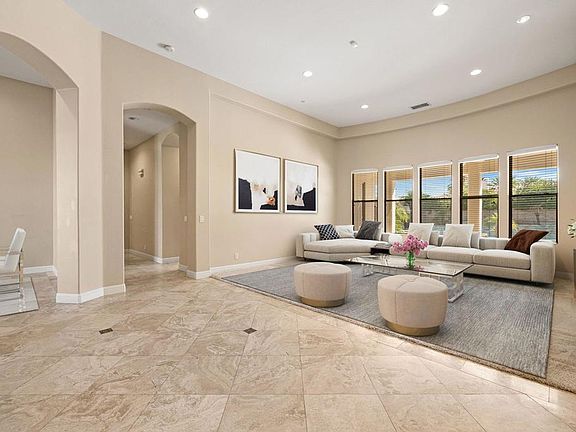 Welcome to this stunning 4-bedroom, 5-bathroom estate located in the highly sought-after gated community of Talante in La Quinta. Offering 3,640 sq. ft. of elegant living space, this home boasts a desirable split floorplan with four en suite bedrooms, each featuring its own walk-in closet, ensuring comfort and privacy for all PLUS a separate den/office/study with custom built in desk unit. From the moment you arrive, you'll be impressed by the upgraded wrought iron double door entry and striking curb appeal. Step inside to find travertine flooring, coffered ceilings, and a layout designed for both grand entertaining and relaxed everyday living including a formal dining room and sun room off the master suite. Situated on a generous cul-de-sac lot, the beautifully landscaped backyard is an entertainer's dream with a newly built pool, perfect for enjoying warm desert days. Additional highlights include a spacious 3-car garage, low HOA dues, and a prime location close to the Empire Polo Grounds, Indian Wells Tennis Garden, world-class golf courses, fine dining, shopping, and top-tier entertainment. This exquisite Talante home truly blends luxury, privacy, and convenience--a rare opportunity in the heart of La Quinta. The home has been freshly painted.
