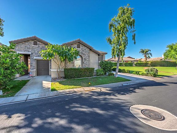 Desert Living Meets RV Enthusiast - and more. A perfect home for those with 'toys'.  A 14 x 45' RV garage with AC & cleanouts, plus a 2-car garage w/AC and a golf car garage is perfect for the car collector, those with a large RV's, boats or perhaps even use this as an art studio. A gated courtyard entry leads to this home with its spacious Great Room layout offering open concept living.  With high ceilings, a cozy fireplace, plantation shutters, custom shade screens, lux vinyl flooring in main living area and breakfast bar in the kitchen,. There is good counter space, a covered patio for outdoor dining and an indoor dining area.  With 2 Bedrooms, 2 1/2 Baths this well-designed home is adjacent to a small parklike area on its north side and is on an interior lot not backing onto a main thoroughfare.  There is just enough backyard to enjoy the outdoors without much maintenance. Located in a welcoming country club setting that has short term rentals (please check current status with HOA & city) this home provides a good mix of privacy and community with access to reasonable golf, dining, recreation & music festivals.