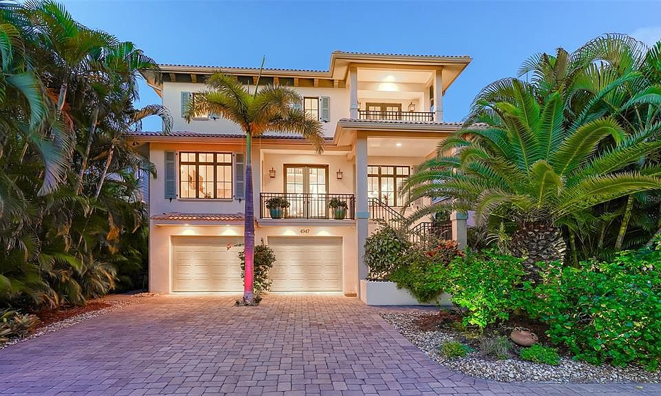 This 4 bedroom, 4.5 bathroom home is the perfect place to vacation where you live. Situated on Siesta Key, this West Indies style home is a tropical retreat; and, with four en-suite bedrooms, is large enough for you and your guests. The main level boasts a soaring foyer. As you enter you will be delighted by the warmth of the refinished hard wood floor, and the light space that welcomes you home. The living room features a high ceiling, a dual sided ceiling fan and high windows flooding the room with filtered sunshine. The cozy gas fireplace makes this the perfect spot to gather with friends on a lovely cool Florida evening. The formal dining room has tray ceilings. The spacious center Island gourmet kitchen, with new gas cooktop, features slab granite counters, stainless appliances, wine cooler and a chef’s desk. Walk upstairs or take the elevator to the master suite. This space, with three walk-in closets, a wet bar, and balcony overlooking the lush back yard is a tranquil sanctuary. Imagine retreating here after a day on the world-renowned Siesta Key Beach. Luxuriate and recharge in the master bath with granite, travertine, 7 head shower, and soaking tub. Step outside and you will find the outdoors are as compelling as the inside. Beautifully designed with a large, heated swim-spa, this is the perfect place to end another gorgeous day in Paradise. Meticulously maintained, and built to high standards, this home has impact windows all around, a full house fire extinguishing system and top of the line finishes. The oversized garage has room for 2-3 cars, a work area, and offers plenty of storage. Located just minutes from the beach, the proximity to downtown Sarasota makes it easy to take advantage of all the dining, shopping, cultural and recreational offerings of the area. This unique home is an incredible find for those who want to live a distinguished Gulf Coast lifestyle!