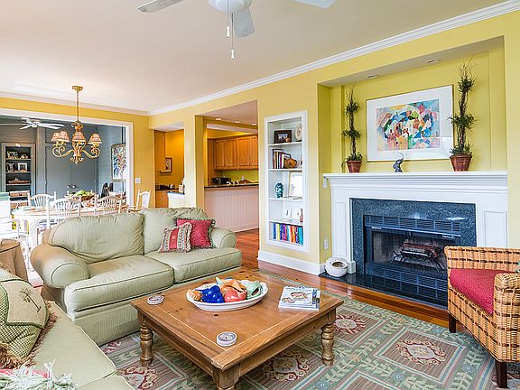 Heart pine floors extend throughout the dining and living area, which also offers built-in shelves and a fireplace with granite surround. The original screened porch has been enclosed, providing additional square footage and a cheerful sunroom with tile floors and shiplap walls.