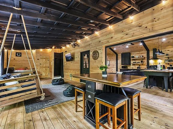 The cabin boasts a fully stocked kitchen with bar seating, perfect for preparing meals and enjoying them together. Relax in the cozy living area equipped with smart TVs and Wi-Fi, ensuring entertainment and connectivity during your stay.