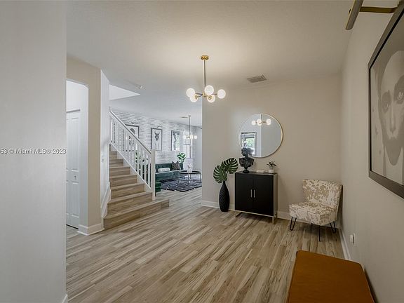 Built in 2017, this 3-bedroom, 2.5-bath, 1,842 sq. ft. gem boasts laminate flooring throughout. Enjoy the convenience of living in a cul-de-sac smart home with smart thermostat, and a Ring Door Bell that are all yours to keep along with the sophisticated light fixtures. You'll also find a 2-car garage and impact glass windows for peace of mind. Upstairs, all the bedrooms, a laundry room and ample storage space. Step outside to the upgraded patio and a backyard perfect for entertaining with outdoor lighting. Best of all, low HOA fees. Plus, a beautiful community pool and children's play area. Centrally located near the Turnpike, shopping, and more. This house won't last.