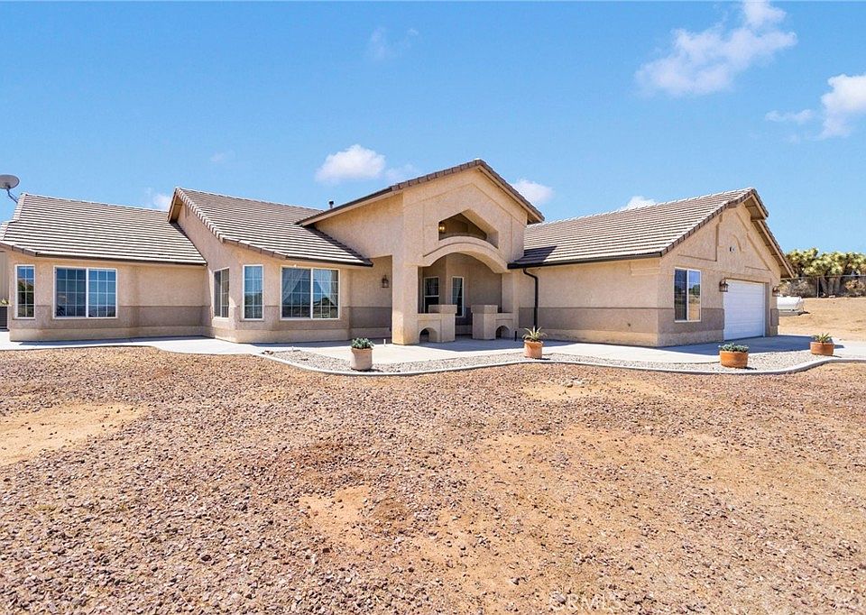Beautiful Open Concept Home with 20 x 40 HUGE RV height Metal Shop! This home is gorgeous. Big open Living, Dining , Kitchen and Bonus Room. Pellet stove to keep those winter nights cozy. Owner's suite with Huge master bathroom with soaking tub. Amazing walk in closet, double sinks, separate walk-in shower, and private water closet. Second bonus room can be used as a 4th bedroom or office. Huge Laundry Room and Walk-in Kitchen Pantry. Unique pot shelves and ceiling above Kitchen. Enjoy the majestic views of the San Gabriel Mountains and the High Desert Valley on your Huge back patio, which is partially covered and leads to a wraparound sidewalk. Fully fenced Dog yard. 2 Chicken coops all on 2.4 acres which is fully fenced. This is a certified Wildfire Prepared Home.
