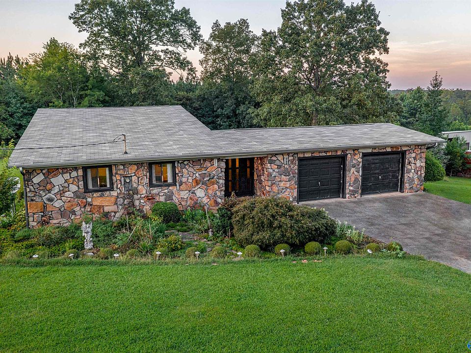 Move right in to this charming 3 bedroom, 2 bath home perfectly set on just over 2 beautiful acres in the heart of Hokes Bluff. Enjoy the peace and privacy of country living just minutes from schools, shopping. Comes with a 2 year old roof and 5 year old HVAC. Step inside to find a spacious sunken family room ideal for cozy evenings. The remodeled kitchen (in last five years) boasts Corian countertops and custom cabinetry, flowing into a vaulted dining room with exposed beams that create a warm atmosphere. This home also offers an oversized garage with an attached storage area and exterior access, plus a large detached storage building for all your hobbies and equipment.