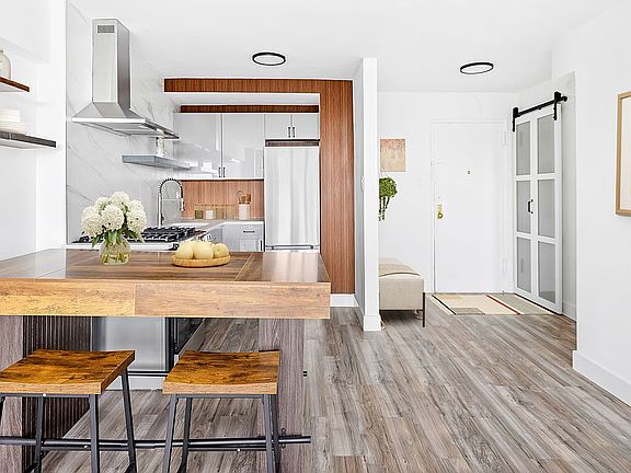 From the moment you step inside this turnkey apartment, you’ll be struck by the elegant and thoughtful details of this complete renovation, including a throughly modern kitchen with stainless appliances, quartz countertops, a luxurious gooseneck faucet, glossy grey cabinetry, and a large but portable kitchen island with 2 stools.