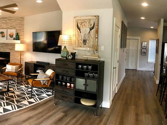 FAMILY ROOM: Open concept great room has a gas fireplace, wine bar with a cocktail prep station, ceiling fan, large format 4k QLED TV and Sonos soundbar, providing the perfect family gathering place for you and your family.