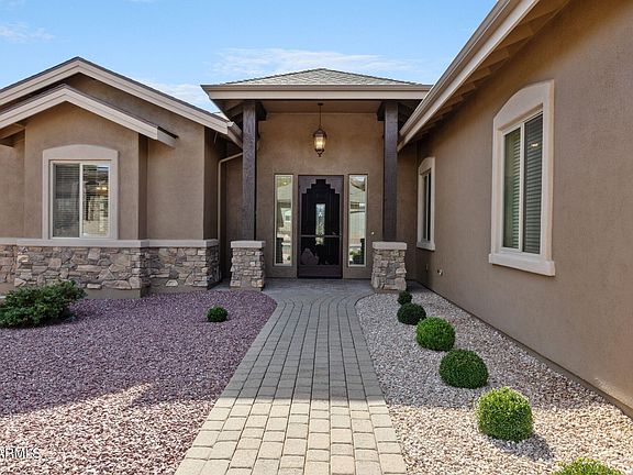 Located in Blooming Hills Estates, this beautiful J.B. Edwards home has spectacular mountain views and is just minutes from downtown Prescott. This 3 bedroom, 3 bath home features a spacious great room, gourmet kitchen, breakfast nook, rustic knotty alder cabinets, 19x18 tile, gorgeous granite countertops and a large storage pantry. Laundry room has tub utility sink and an additional spacious storage closet. Lovely dining area with built-in hutch. Quiet-close cabinets and pull-out drawers. 9+ft ceiling height throughout. Gas fireplace, 2 tone paint, ceiling fans in bedrooms, horizontal blinds, LG refrigerator, LG washer and dryer, KitchenAide Dishwasher, KitchenAide Microwave, In SinkErator Disposal, 30'' Wolf gas range, and central vac. A spacious master suite with walk-in closet, double vanities with makeup counter, large soak tub and separate walk-in shower in the master bathroom. Ensuite with walk-in closet and walk-in shower. Third bedroom/office. Berber loop carpet in bedrooms and hallways. Brick pavers on flat driveway, walkway and covered back patio. Fenced back yard. Drip Orbit irrigation system, Storm gutters. ''Energy Star'' Certified in 2009, with R-23 and R-19 Insulation.