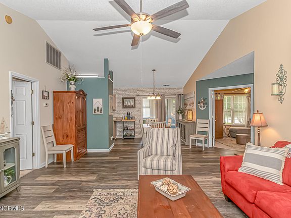 Discover the charm of this well-maintained stick-built home situated on a beautifully landscaped corner lot in Saltaire Village! As you step onto the cozy front porch and through the storm door, you're welcomed into a spacious living room featuring vaulted ceilings, stylish LVP flooring, and a ceiling fan for added comfort. The open dining area flows seamlessly into the kitchen, equipped with stainless steel appliances, ample cabinet space, a pantry, and a combination of black and white appliances, making it the perfect setting for preparing meals.