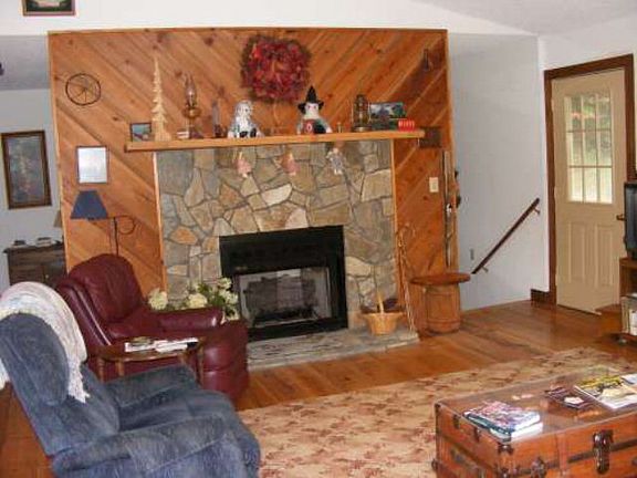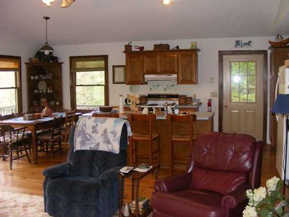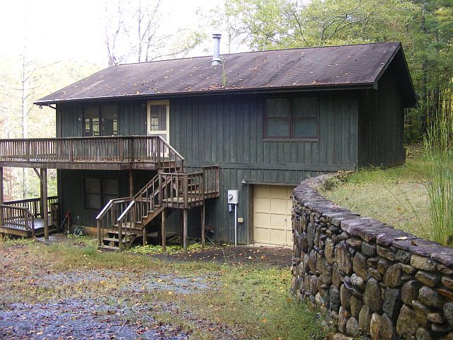 Nice mountain home on 8.64 acres with stream in front of property. Grassy area near road and wooded from there to top of property. Would be good for primary or 2nd home. Wide-board floors in great room. Rock fireplace with gas logs and attractive, rustic mantle. Lot of sleeping space and house can be mostly furnished if buyer desires. Seller can provide a list of things that do not convey. Upper and lower decks, as well as large rock wall lining driveway near garage. This one is worth seeing and priced to sell.