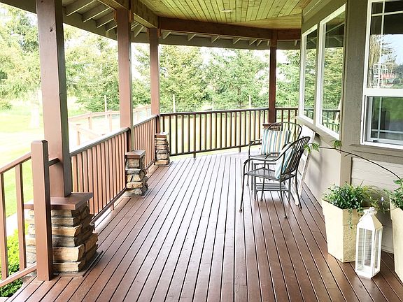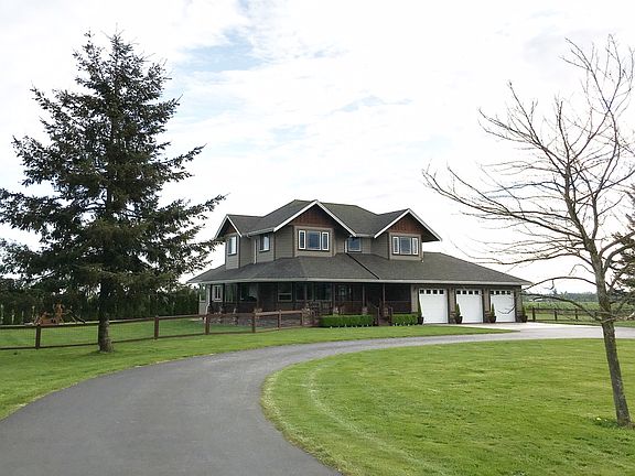 Beautiful custom home on nearly 2.5 acres in mid-county location! Sits back on paved private lane with views of Mt Baker from kitchen, upstairs bedrooms, and fully fenced back and side yard. Features include: 4 bedrooms (or 3 plus large bonus room) with master on main, 2.5 bathrooms, 2 living spaces, 10 foot ceilings w/vault, large wrap around porch, and 3-car garage w/extra deep bay and storage. Dont miss the 24x30 shop/garage and RV space w/concrete pad and hookups, accessed by separate entrance.