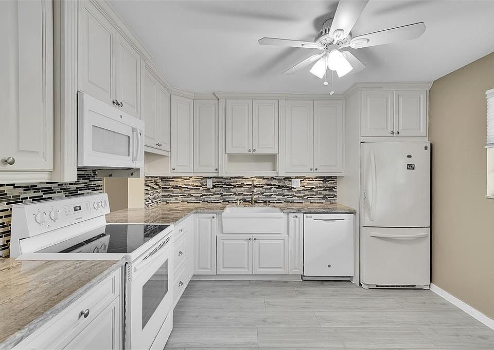This beautifully updated condo is ready for immediate enjoyment. The custom kitchen is a highlight, featuring granite countertops, a farmhouse sink, crown molding, and a decorative backsplash. Durable vinyl flooring flows throughout the entire home, which has been freshly painted for a bright, clean look. The master bathroom has been updated, and you'll find abundant storage with huge walk-in closets and a massive utility room complete with a full washer and dryer. Relax on the expansive lanai and take in the picturesque lake views. Peace of mind is guaranteed: the Roof and Elevator are NEW and fully paid for by the Seller, and the A/C was replaced in 2022.