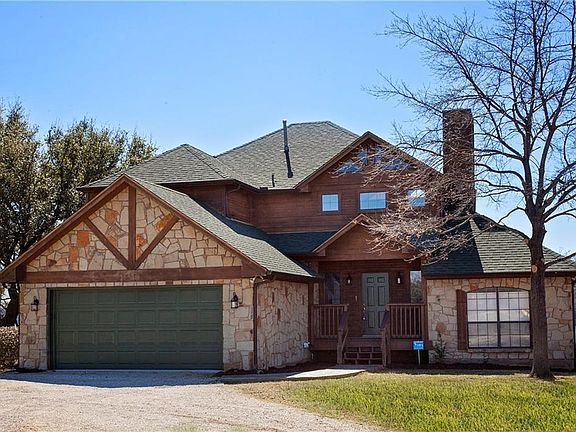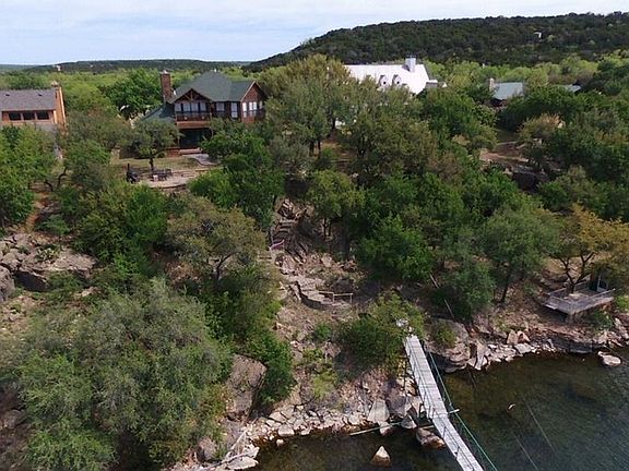 Charming stone & cedar custom home has splendid design providing living areas on second story that capture amazing natural vistas. DEEP WATER, 2 story boat dock with slide, rope swing, boat lift, 2 PWC lifts. New paint and carpet, beamed ceilings, stone fireplace, newer kitchen with granite counter top, European cabinets, stainless steel appliances. Main-level master suite with walkout back porch. Stone decks, terraced, natural walk thru boulders under oaks down to deep water shoreline. Sprinkler system. Large front yard with circular dive to attached finished garage. Terrific lake location in neighborhood of fine lake estates. Income possibilities as short term rental.