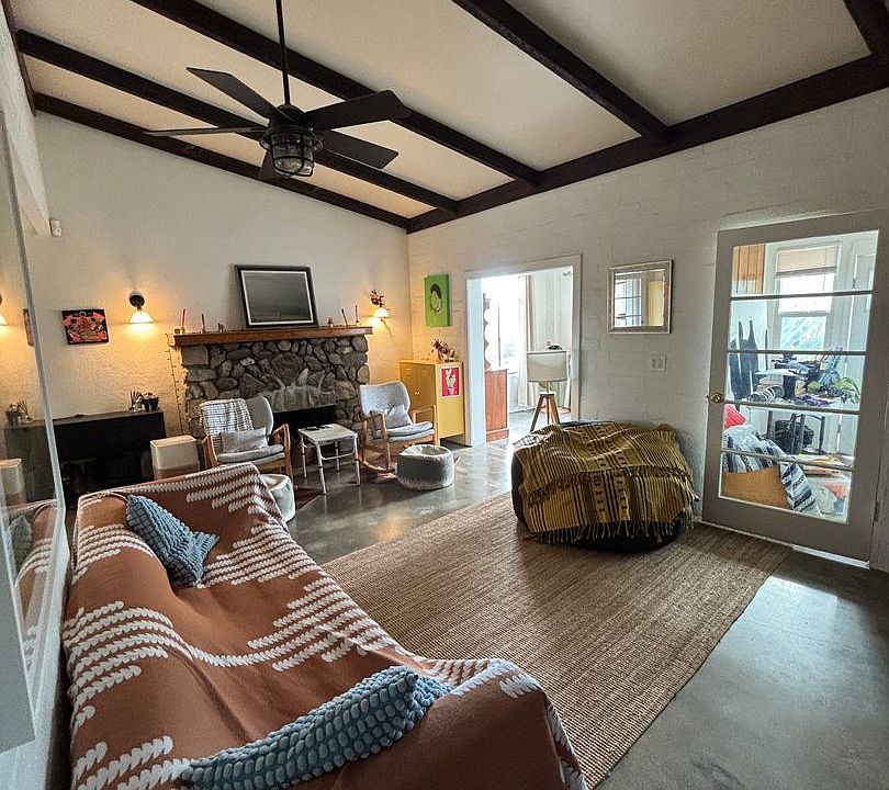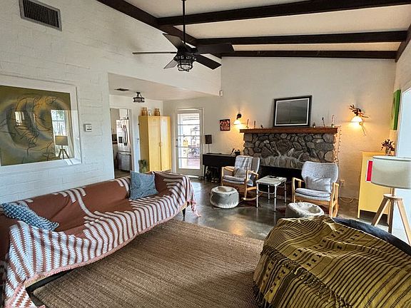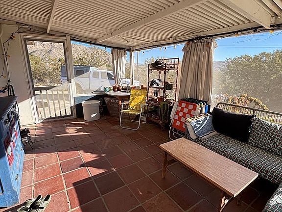 Welcome to this charming and secluded 2-bedroom, 1-bath home in Morongo Valley. Offering 1,054 sq ft plus bonus rooms. Concrete floors keep the space cool, while the living room features exposed beams and a wood-burning fireplace that create a warm, inviting atmosphere. A dedicated office and a sunroom with tile floors provide perfect spaces for working or unwinding.