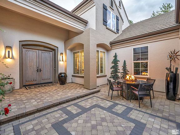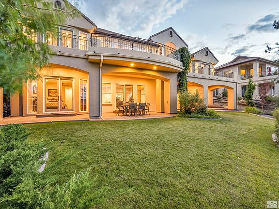 Welcome to the ultimate view home! Enter through the beautiful iron gates to the Private Courtyard newly refreshed with pavers, custom artistic Tahoe Mural metal work, Fountain with lattice as a perfect setting for expanding the outdoor space to enjoy any time of day and sets the stage to this magnificent home. Located perfectly in the prestigious gated community in Caughlin Ranch., The main level is ideal with the Grand Greatroom, Gourmet Kitchen, Spacious Primary Bedroom, Living Room/Library ALL being the focal point, showcasing the expansive northern views and illuminating City Lights! Enjoy this easy flow and functional floor plan! Kitchen features sweeping double islands, newer Black Magma Granite countertops with built-in pop up Outlets. Equipped with a 6 burner GE cooktop/oven and a newer convection oven. Newer appliances including microwave, oven, dishwasher and refrigerator. Plenty of workable space and a large island ideal for the gourmet chef! Refurbished cherry wood cabinets throughout the home and library. Sound system in kitchen nook area. Beautiful tile flooring with medallions throughout the living areas on the main level. Spacious Primary Bedroom on the main level with access to the deck to enjoy the outdoors and awesome city views. Large custom closets with built-ins. Library or Formal Living Room at Entry with tall dramatic ceilings and lots of windows to bring in all the natural light and City Views! Double sided fireplace to the family room or great room! Formal Dining room is being used as a sitting room and is nicely located for entertaining. Laundry Room has a water filtration system, newer granite counter tops and lots of storage. Lower level includes a Movie Theatre Room including state of the art equipment, speakers and projector. Both glass wall Rail City Casino pieces are included and are one of a kind Reno history art. Plus 3 very good size bedrooms with each having their own en-suite. Mechanical rooms with tons of storage and wine closet. Upstairs loft is perfect for an office or lounge overlooking the main level and is in addition to the 4 bedrooms and has a full bath. Newer exterior and interior paint, newer gutters, carpet stairs and loft. Back deck has GACO sealant, a high quality roofing material. Garage has custom storage units, newer insulated garage door and epoxy flooring. Come hang out on the deck and allow time to wander the backyard to enjoy all this home offers. Common space allows additional space and open feel. Plenty of outdoor backyard space with mature landscaping, covered patio and lawn area. Centrally located in a highly desirable neighborhood with a tax-friendly state.