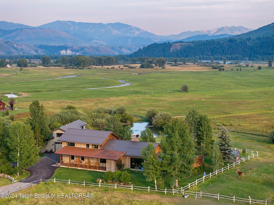 Nestled at the end of a tranquil country road, this beautiful home offers unparalleled privacy and borders expansive private ranch land. This is undoubtedly one of the best locations in Jackson Hole. With 3,400 square feet of thoughtfully designed living space, the main residence features 3 spacious bedrooms and 4 bathrooms. The property also includes a 3,000-square-foot barn with an 850-square-foot guest house overlooking a spring-fed pond all set on 5.42 acres. Enjoy breathtaking views of Munger Mountain and the Teton Range, making this the perfect retreat for those seeking both comfort and seclusion.