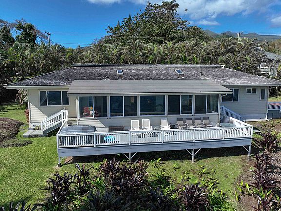 Rare oceanfront opportunity in the heart of Hana, offering sweeping, unobstructed Hana Bay views, cooling trade winds, and the soothing sound of waves as your daily backdrop. This private island-style residence rests on a generous oceanfront lot, along this culturally rich coastline. Designed for seamless indoor–outdoor living, the home features open living areas, expansive lanais, and architectural elements that embrace the surrounding natural beauty. Enjoy breathtaking sun and moonrises, with the tranquility that defines life in Hana. Minutes to beaches, eateries, waterfalls, and off the world-famous Road to Hana. E Komo Mai! Come make this 3 bed 2.5 bath enchanting oceanfront home yours.