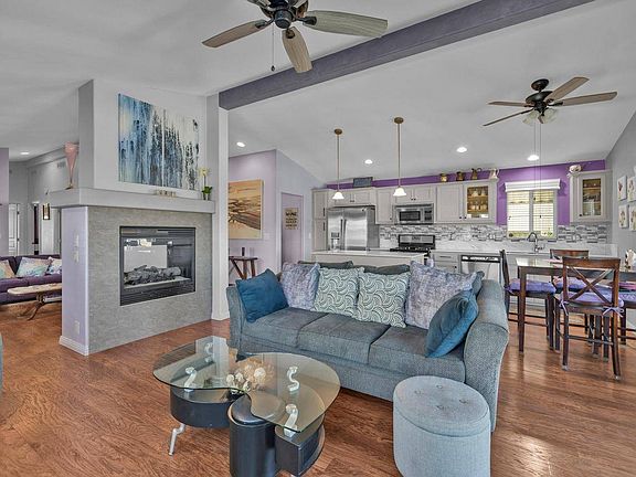 Tucked away in the San Diego hills is The Cliffs, a charming 55+ community with sensational views. This 2012, 3 BR (or office), 2 BA home features beautiful custom accents, including vaulted ceilings, a 2 way fireplace, luxury vinyl plank flooring, and bull nosed corners throughout. A generous primary bedroom opens to the second bedroom to make an intimate adjoining office. A third bedroom is perfect for guests or other uses. The gorgeous kitchen features custom counters and backsplash and matching a center island with under counter wine refrigerator. A Sun Setter patio awning with wind sensor protects the all weather fun deck. In the carport, two storage sheds have been conjoined to create one larger unit for additional storage or compact tool shop. Ample guest parking is available at the auxiliary clubhouse immediately across the street. (LBL5002)