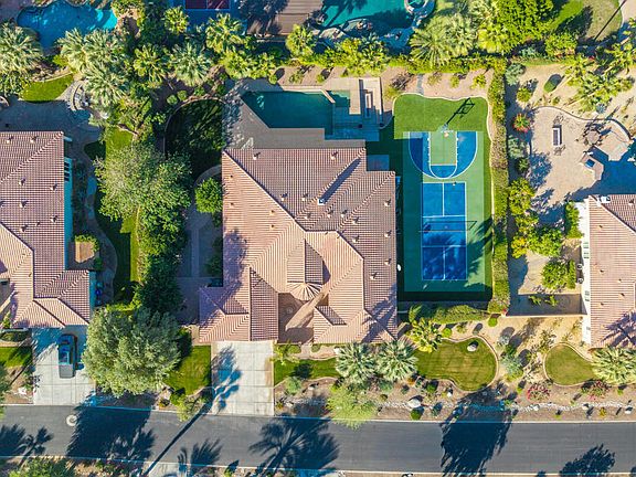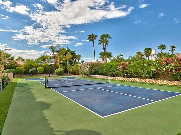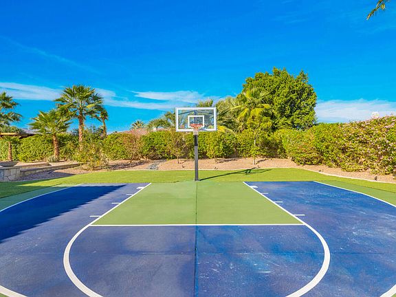 Welcome to Desert River Estates--an exceptional luxury retreat offering the ultimate in desert living. Situated on over half an acre. This impressive 4,056 sq. ft. smart home estate features 4 bedrooms, 4 bathrooms, an office, and an expansive open floor plan designed for both comfort and sophistication. The resort-style backyard is an entertainer's dream with a sparkling pool and swim-up bar, professional-length pickleball court, half-court basketball setup with NBA-rated glass backboard, sunken fire pit lounge, BBQ area, and extended covered patio. Inside, soaring ceilings and abundant natural light highlight the seamless flow between the chef's kitchen, great room, and formal dining area. The luxurious primary suite includes a spacious walk-in closet and spa-inspired bath, while the private en suite casita provides ideal guest accommodations. 4 car garage. Side area great for RV Parking. Recent upgrades include new interior paint, Phillips Hue Smart Lighting throughout the home, refinished cabinetry, designer flooring, smart pool and lighting systems, variable-speed HVAC with hospital-grade filtration, epoxy garage floors, two EV chargers, and upgraded smart toilets. The grounds feature an enhanced irrigation system and multiple mature fruit-bearing trees, including citrus and stone fruit varieties. Located in the gated enclave of Desert River Estates near 49th and Jefferson--just moments from the Empire Polo Grounds, home of Coachella and Stagecoach--this residence rests on one of the community's largest lots. A true desert sanctuary blending elegance, privacy, and resort-style luxury.