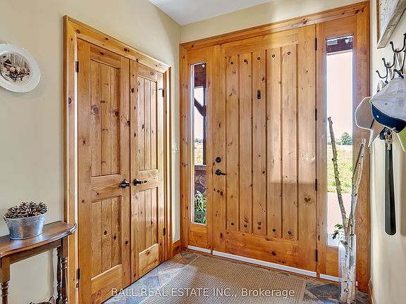 Private country living with over 100 acres of paradise. The property allows for passive income through farming options that can allow for possible tax breaks. Excellent custom built home for entertaining. Huge windows. Cathedral ceiling, gas fireplace, sunroom, warp around deck, main floor mud/laundry room. Two piece powder room on main level. Custom kitchen with stainless steel appliances, large island with prep sink, bar fridge, wine rack, granite countertops. Primary bedroom with walk-in closet, ensuite bath with in-floor heating, heated towel rack, separate shower, claw tub, his/her sinks. Large deck. Lower level: Three bedrooms , three piece bath, walk-out garden doors. Large cold storage room with sink. Note: 3600 square feet of finished living space! 1800 sq ft finished on main floor PLUS an additional 1800 sq feet finished basement. An entertainers delight featuring: heated custom built room with golf simulator in the 5,000 square foot garage, five garage doors with operators, two mezzanines. The reinforced barn includes a custom Bunkie for additonal guests / storage. **Extras** Handicap accessibility throughout the house, non-smoking property.