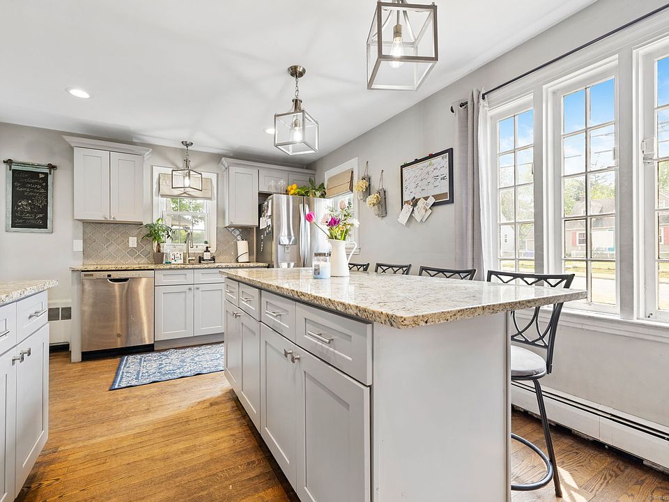 Welcome to your dream home! FIRST TIME HOMEBUYERS, ask your lender if you qualify for the $25,000.00 grant from CHFA. This beautifully renovated Cape Cod-style residence has a perfect blend of classic charm and contemporary convenience. Boasting 3 spacious bedrooms and 2 full bathrooms, this home has been meticulously updated in 2019, ensuring a move-in ready experience. Step inside to discover a bright and inviting living room featuring a cozy wood-burning fireplace, ideal for those chilly evenings. The hardwood floors throughout add warmth and character, creating a seamless flow from room to room. The heart of the home is the expansive kitchen, complete with stunning granite countertops, stainless steel appliances, and a generous central island that provides ample space for cooking and entertaining. Whether you're hosting family gatherings or enjoying a quiet meal, this kitchen is sure to impress. On the first floor, you'll find one comfortable bedroom and a full bathroom, making it perfect for guests or multi-generational living. Upstairs, two additional bedrooms provide plenty of space for family or a home office. Enjoy the convenience of a laundry room on the first floor, with additional hook-ups available in the basement, allowing you to transform the laundry space into a dedicated office or craft area. Outside, the large, private backyard is a true oasis, offering plenty of room for gardening, play, or relaxation.