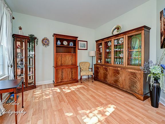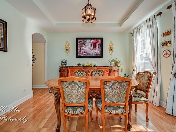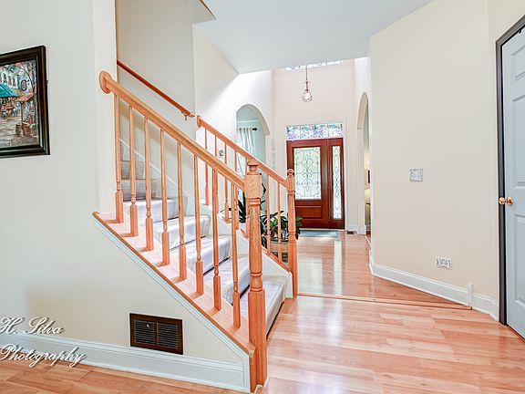 Welcome to White Oaks Subdivision! This stunning Coventry model offers 4 bedrooms, a main floor den, 2.5 baths, a finished English-style basement, and a 3-car garage. The home showcases impressive curb appeal with a mostly brick exterior, professionally landscaped grounds, a brick paver front porch with swing, new roof in 2023, and a new front and screen door installed in 2019. Inside you are greeted by a spacious open foyer with hardwood floors, updated lighting, and open sight lines to the formal living and dining rooms, perfect for entertaining. The main floor den with French doors adds flexibility, while the family room features a wood-burning fireplace, abundant natural light, and a beautiful custom farm accent wall designed for TV and entertainment. The kitchen is truly the heart of this home and a chef's dream, offering quartz countertops, upgraded cabinetry with crown molding, under cabinet lighting, marble backsplash, stainless steel appliances, coffee bar, pantry, and a spacious breakfast area overlooking the firepit. Upstairs you will find four bedrooms with hardwood laminate flooring, cedar-lined closets, custom sliding doors, and ceiling fans. The primary suite is a retreat with French doors, vaulted ceilings, double vanity, garden tub, separate shower, and a custom walk-in cedar closet with full organization system. The finished English basement offers a massive recreation space with recessed lighting, decorative cutouts, and a rough-in for a third full bath, along with plenty of storage. The private backyard oasis features a deck, firepit, mature trees, rock garden, walking paths, shed, and wood picket fence. Major updates include new HVAC with UV light and humidifier in 2024, new 50-gallon water heater in 2024, and epoxy garage floors in 2021. Located near White Oaks Park, Carpenter Park, shopping, schools, and I-90 access, this home is truly the one to see!