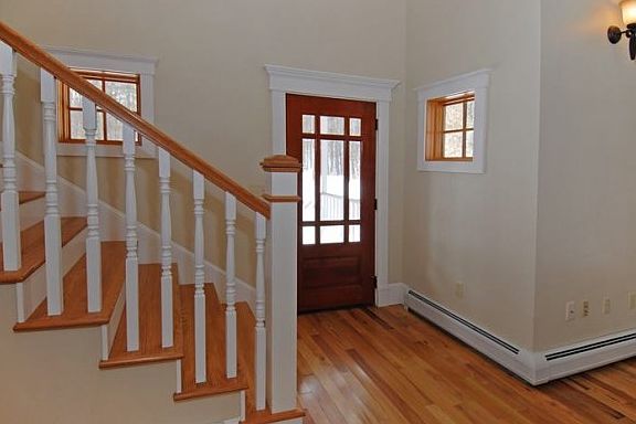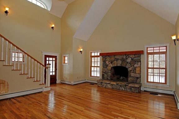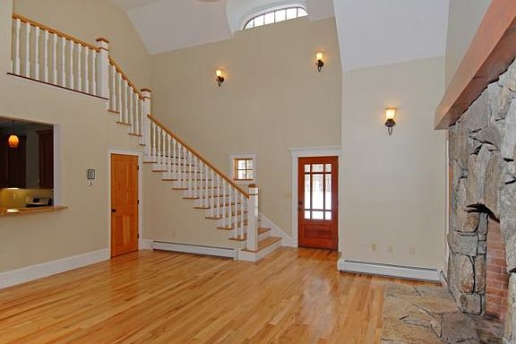 For more information please call Adam Dow, Listing Agent, 603-867-7311. This beautiful 3 bedroom home offers large, open spaces, unusual architectural details, and light-filled rooms that flow easily from one to another. The massive stone fireplace dominates the living room, with a vaulted ceiling and French doors that open to the deck and back yard. The kitchen features cherry cabinets & granite counters, and the entire first floor is done in hardwood. The master suite opens into a private enclosed porch, and the master bath includes a large soaking tub, separate shower, double sinks and a walk-in closet. Upstairs you'll find two large sunny bedrooms, another room that could be an office, and a full bath. The large basement has a woodstove and provides lots of storage space, there is an attached garage, and wraparound decks are where the summers will be spent. This is a lovely home on a beautiful, private two-acre lot.