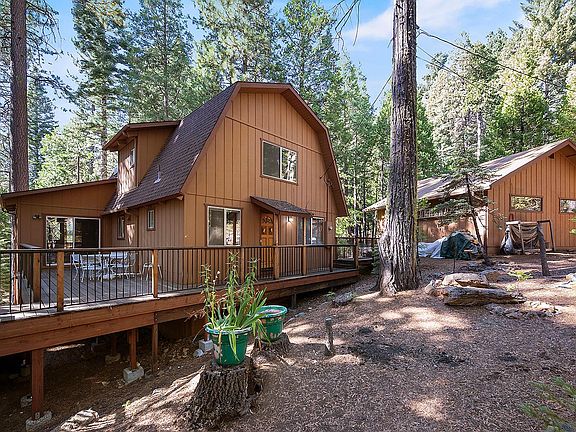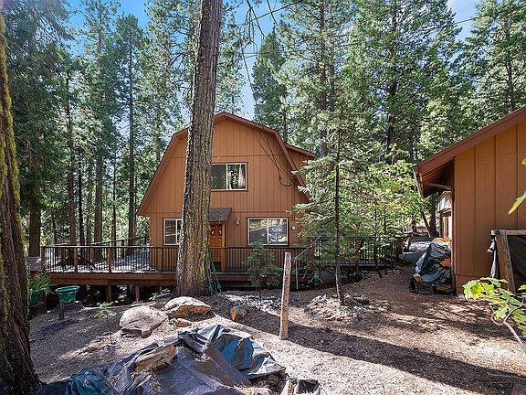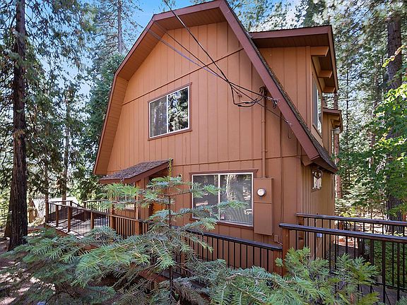Come enjoy a comfortable cabin nestled in a peaceful forest setting that situated with two parcels and a total of .78 acres. This Gambrel style cabin has a primary bedroom, laundry, full bath, open great room and dining area on the main level. Upstairs is a large bonus room, additional large second bedroom and full bath. Two separate decks situated among the dogwood, fir & cedar trees allowing amble outdoor entertaining space or a location for hot tub where you can soak your woes away. Wood stove, electric heat, storage shed and an oversized two car garage. With optional access to Big Trees Village Rec Facility this home has all the amenities you may be looking for. Sale includes adjacent lot 516 Wikami Way APN 023-072-011. Schedule time today to preview this little gem.