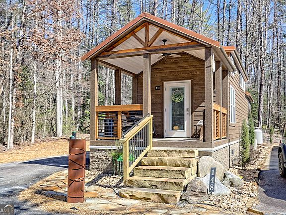 Introducing a stunning 2022 park model tiny home sold fully furnished, on a large premium lot surrounded by hardwoods for privacy, in the beautiful Sugar Mill Creek at Lake Burton gated community. A covered rocking chair porch welcomes you to this charming 532 sq ft home, including the spacious loft for guests. As you step inside, you'll find a warm and inviting living space with high ceilings and shiplap walls throughout. The kitchen includes a breakfast bar, upgraded soft-close cabinets, stainless steel appliances including dishwasher, and stackable washer/dryer. Behind a pocket door, you'll find custom built floor to ceiling pantry cabinets with a coffee bar, and a full bath with tub. At the end of hallway a comfy queen size bedroom with built-in dresser/closets awaits, featuring double doors opening to a private outdoor oasis. The 10' x 12' screened back porch leads to an extended 15' x 15' deck, with plenty of room to entertain guests for a gathering. This low maintenance property has been professionally hardscaped throughout with a terraced back yard, perennial plantings and an inviting fire pit surrounded by adirondack chairs, perfect for enjoying the serenity of the beautiful North Georgia mountains! Sugar Mill Creek at Lake Burton is a private, gated, resort-style community. What makes this tiny home community truly special is its proximity to some fantastic local spots. We're just a stone's throw away from Bleu Canoe, a local favorite, and Larpades Marina which boasts four delightful restaurants is only 3 miles away. If you're an outdoor enthusiast, you'll love the nearby hiking trails, waterfalls, and the magnificent Lake Burton. It is conveniently located near Laprades Marina, Moccasin Creek State Park, and several "local" restaurants, and is perfectly situated between Clayton, Helen, and Clarkesville, Georgia. So, whether you're seeking to relocate, or planning peaceful getaways, this cozy retreat offers the perfect blend of relaxation and adventure. Join our welcoming tiny home community and discover the joys of mountain living.