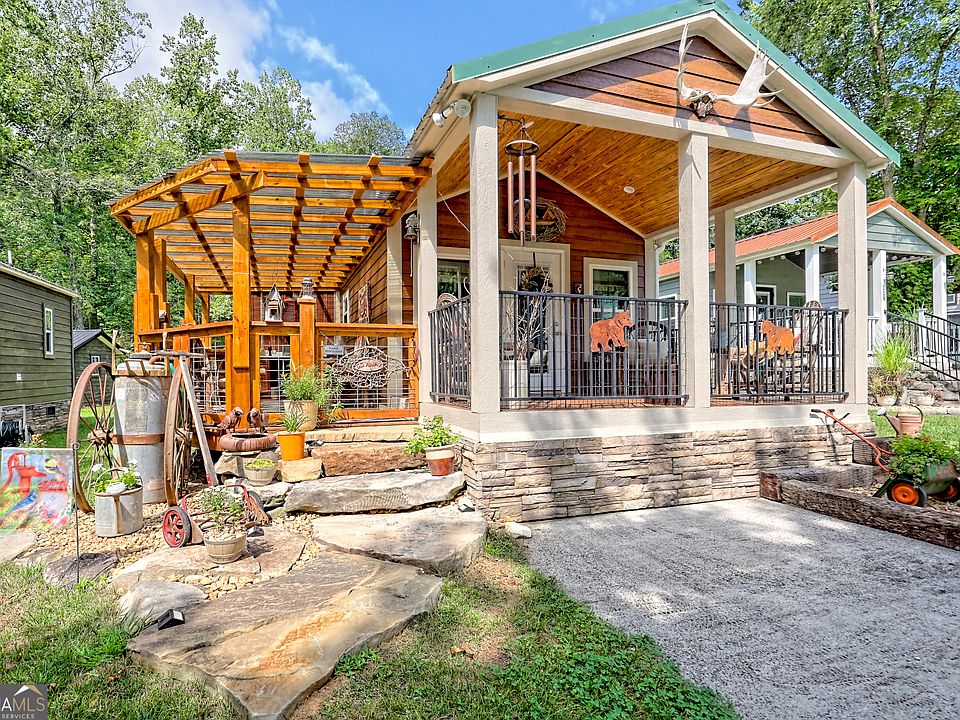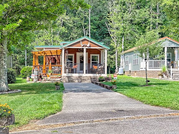 Charming and low-maintenance, this cozy home at Sugar Mill Creek is designed for comfort, relaxation, and outdoor living. Large natural stone boulder steps lead to covered porches that welcome you and your guests. Inside, enjoy warm wood finishes, a cozy fireplace, and a thoughtfully designed kitchen with a double stainless sink, dishwasher, washer/dryer, pantry, and counter top seating. The expanded bedroom includes a 7' clothes closet with mirrored slider doors. The office area opens up to a private deck thru the glass sliding door. the deck leads to a 6 person hot tub and an outdoor kitchen counter with custom cabinets and outdoor dining area. A detached shed offers a workbench, wardrobe, and tool storage-plenty of space for your gear. The backyard is your personal haven, featuring a babbling brook, hammock, shade trees, and a stone fire pit-perfect for unwinding. Located in the gated, resort-style community of Sugar Mill Creek at Lake Burton, you're just minutes from local favorites like Bleu Canoe, Laprades Marina with four restaurants, hiking trails, waterfalls, and Lake Burton itself. Conveniently situated between Clayton, Helen, and Clarkesville, this is mountain living at its best-ideal for full-time residence or peaceful getaways. Come experience the perfect blend of serenity, adventure, and community. Since the owners occupied the residence part-time in the summer, the home looks pristine.